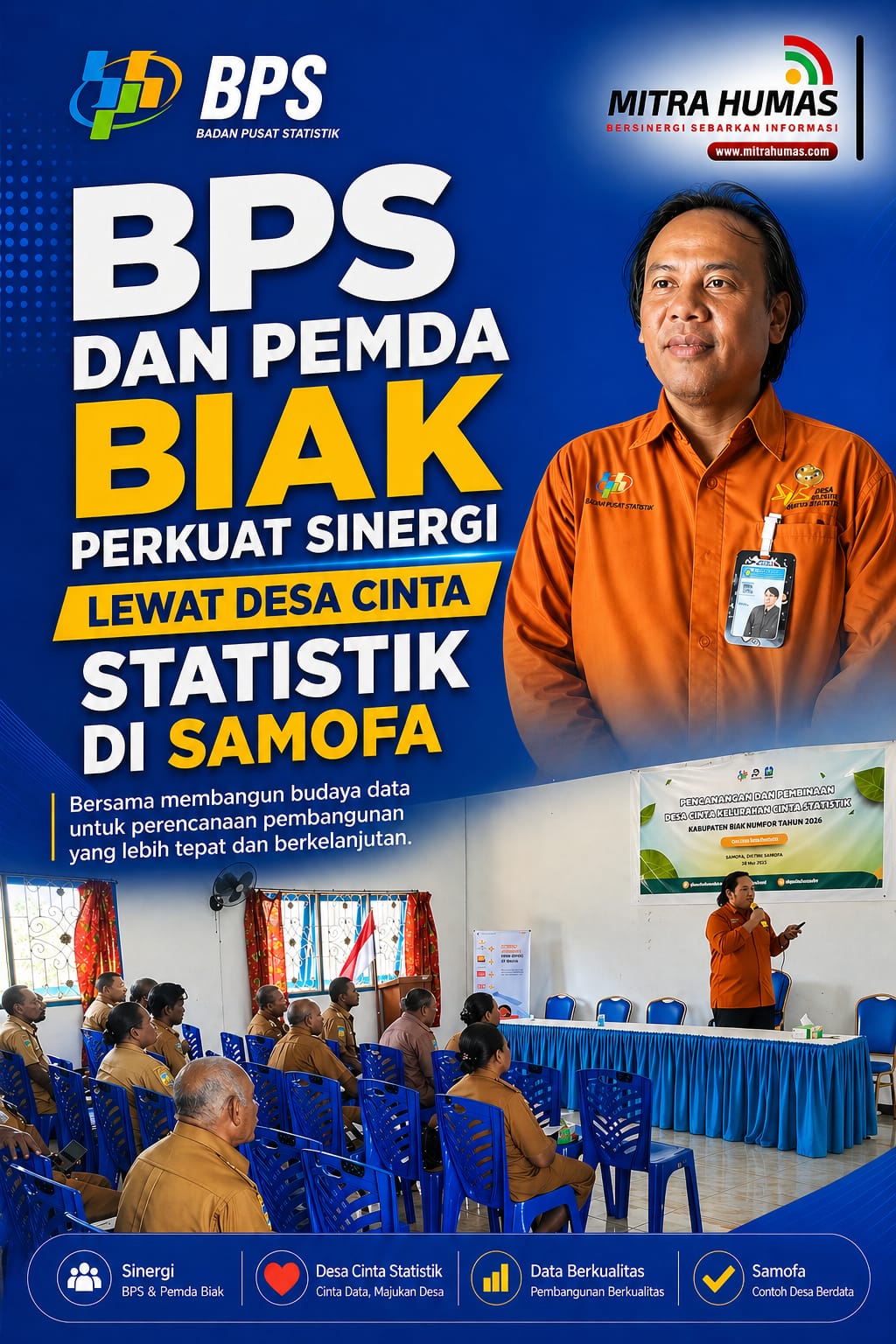 MITRA HUMAS | BIAK NUMFOR, 28 April 2026 — Penguatan sistem statistik daerah memerlukan pendekatan holistik yang dimulai dari tingkat administrasi terkecil. Menyadari hal tersebut, Akhmad Fauzi, Kepala Badan Pusat Statistik (BPS) Kabupaten Biak Numfor, mengumumkan pencanangan seluruh 18 wilayah administratif di Distrik Samofa—terdiri atas 11 kampung dan 7 kelurahan—sebagai Desa Cinta Statistik (Desa Cantik), Selasa (28/4/2026), di Kantor Distrik Samofa.